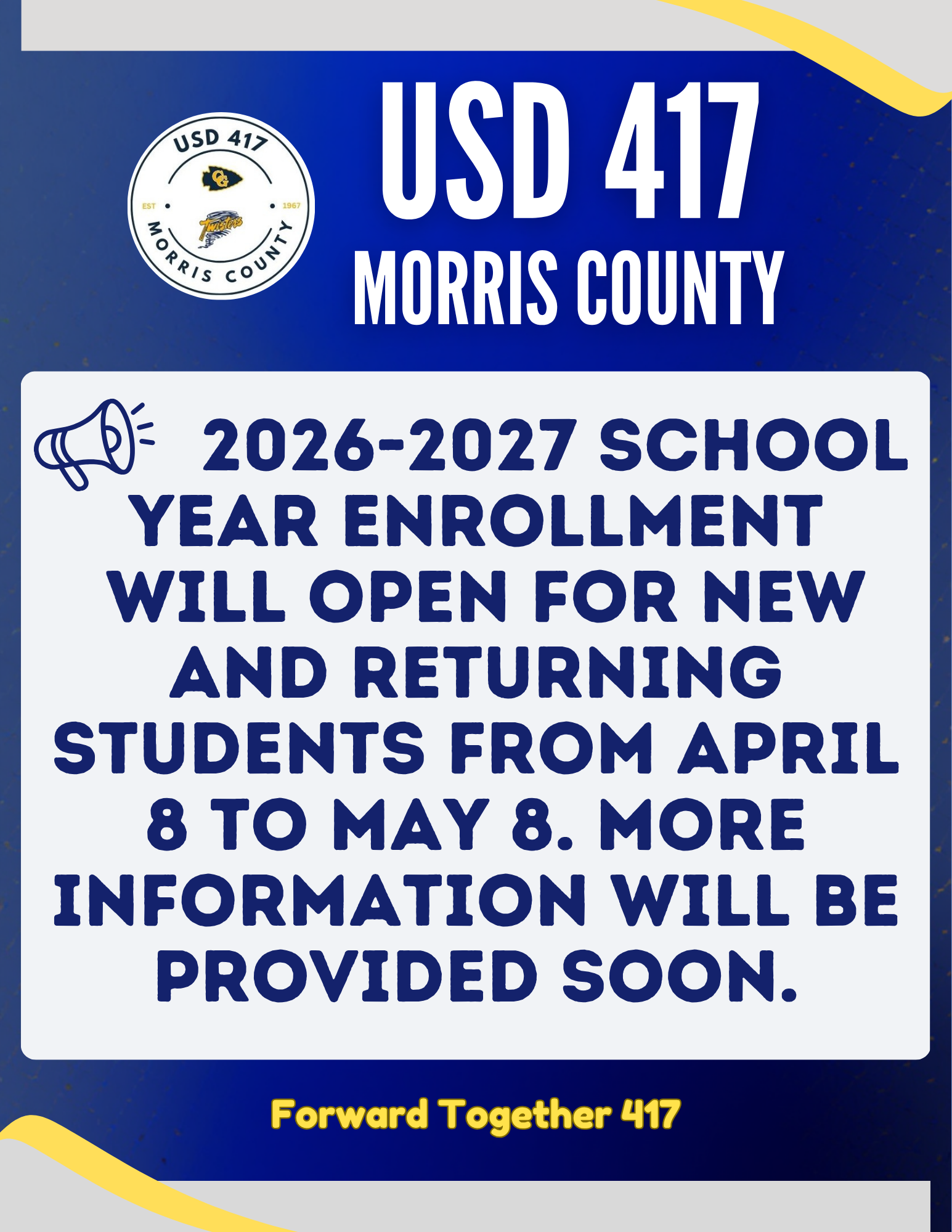 Enrollment for new and returning students at USD 417 will begin on April 8 for the 2026-2027 academic year. More information will be shared next week to assist you with the enrollment process.#Forw...